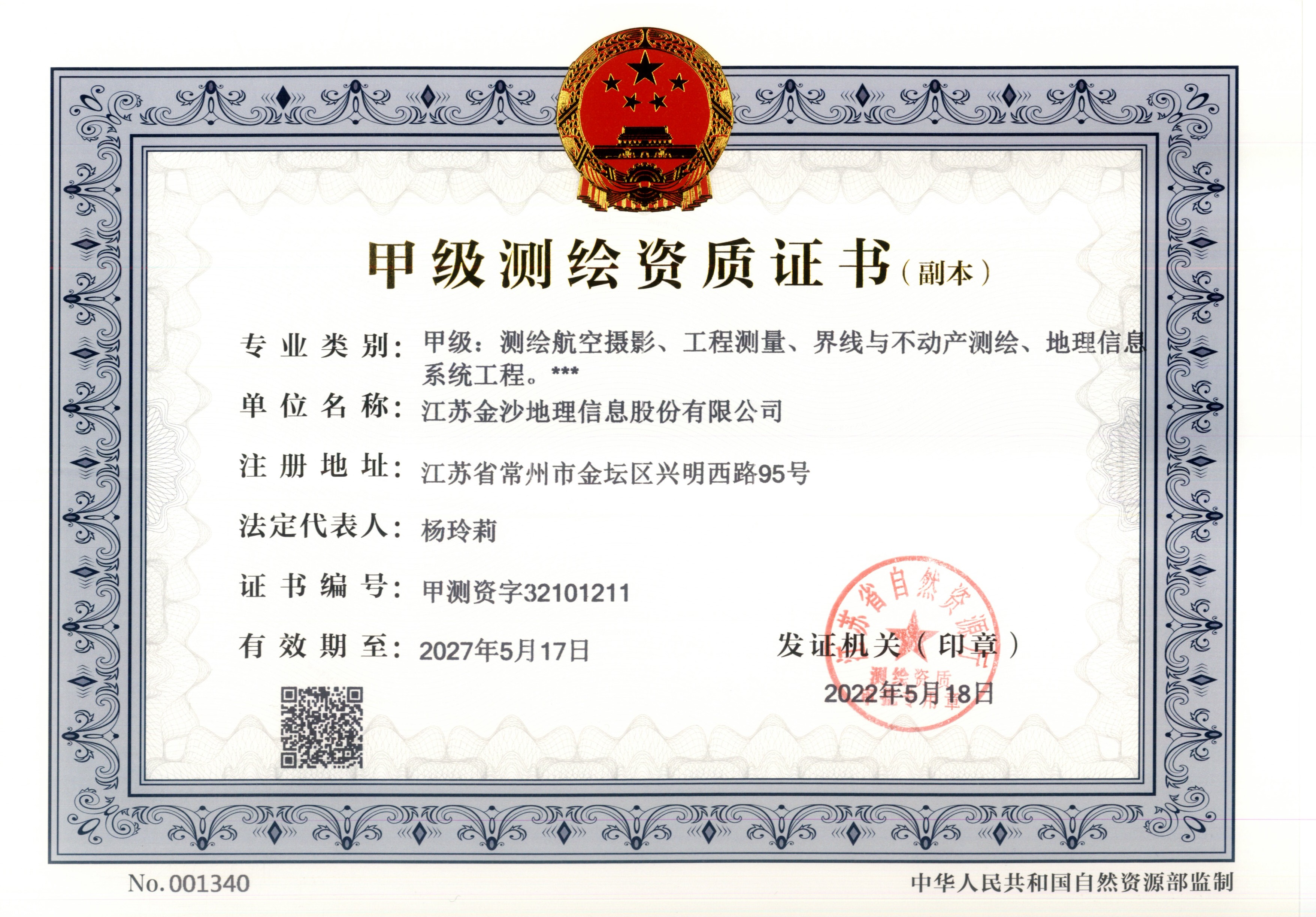 喜報:江蘇金沙地理信息股份有限公司榮獲甲級測繪資質證書